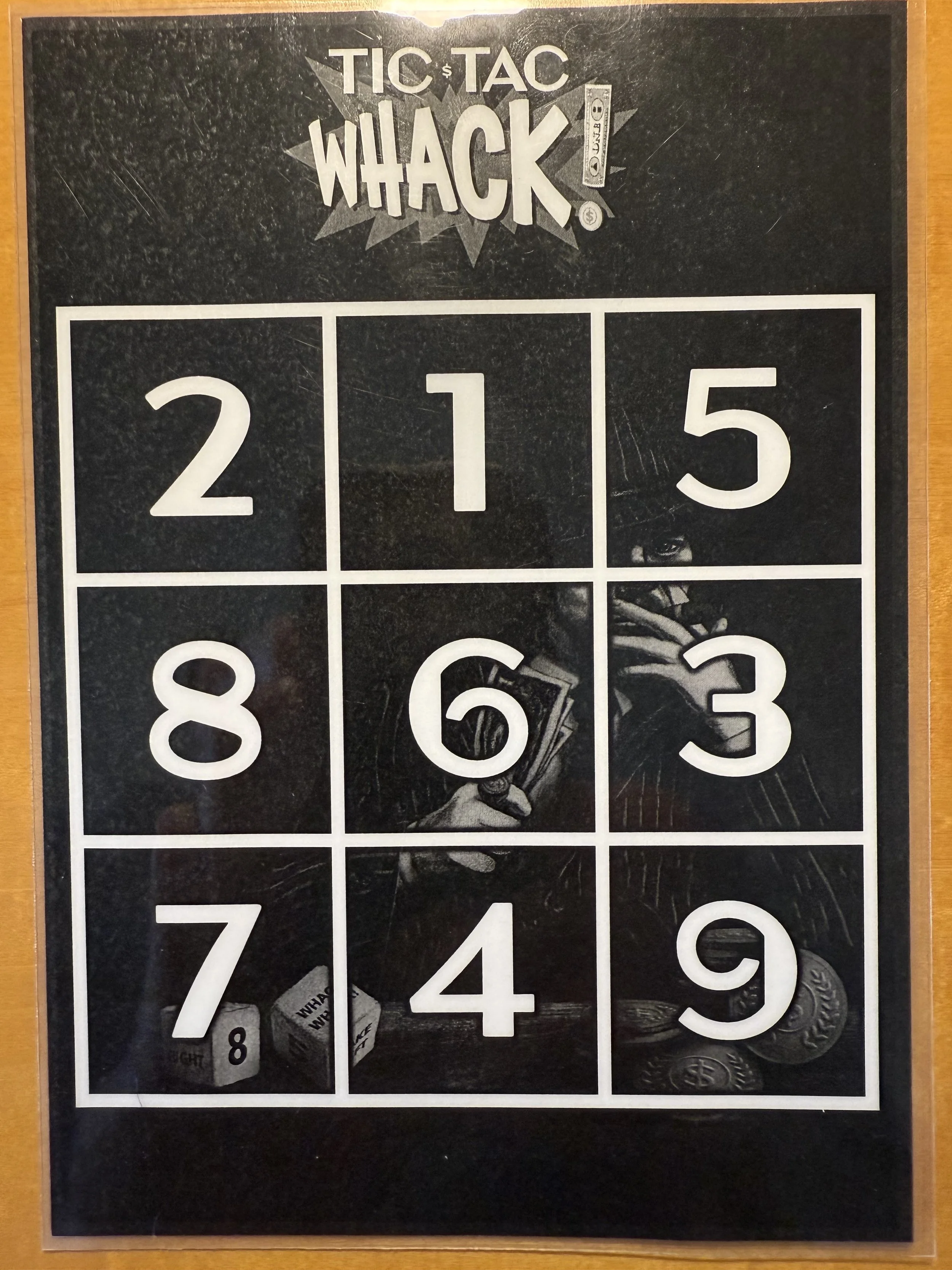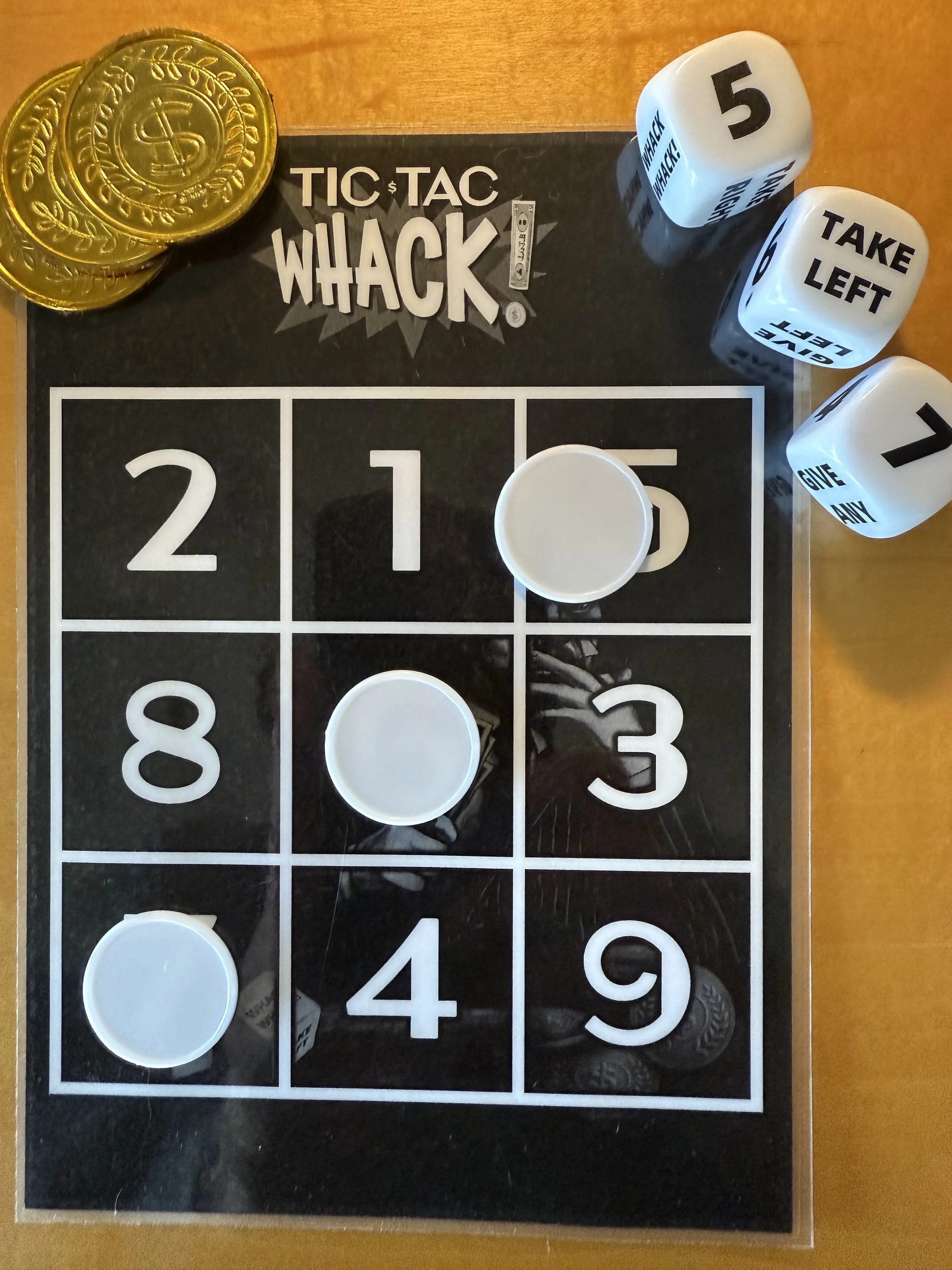 Tic Tac Whack is a fast paced, easy to learn board game that blends “Tic Tac Toe”, “Bingo”, “Left Right Center” and “Dice Shooting” all into one exciting experience. Players will need some luck to win (always possible in this game). BUT they will also need to master a strategy - - - and - - - must be MORE than willing to exact a ruthless revenge on their fellow players - aka Mobsters!